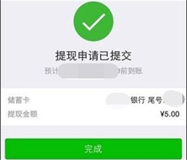 四、完成上一步后,就可以看到微信红包提现申请已经提交的提示了,通常会在一个工作日内到账,下方会显示大概的预计到账时间,只要点击底部的【完成】就可以了。