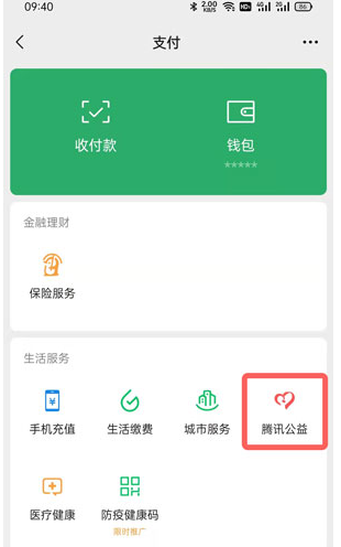 2、也可以直接在【我的】-【支付】-【腾讯公益】直接进入;