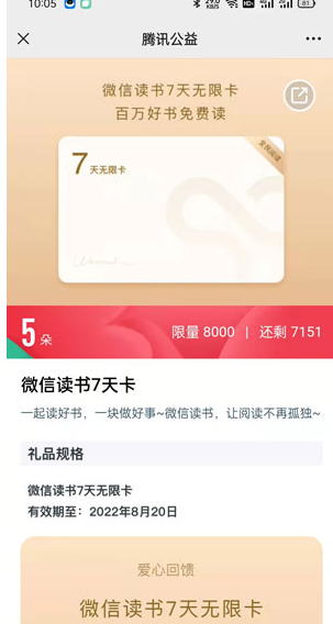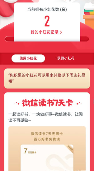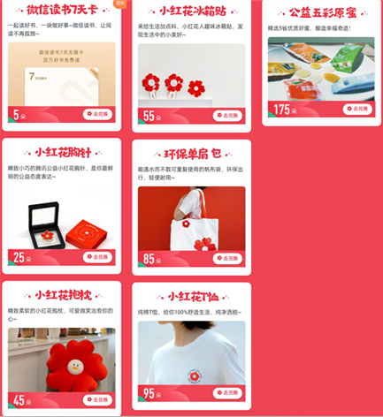 在腾讯公益中获得的小红花,可直接用来兑换微信读书7天卡、小红花胸针、小红花抱枕、小红花冰箱贴、环保单肩包、小红花t恤、公益五彩原蜜。