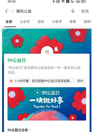 1、打开手机微信,搜索【腾讯公益】,然后点击【99公益日】活动进入,或点击上方地址直接进入;