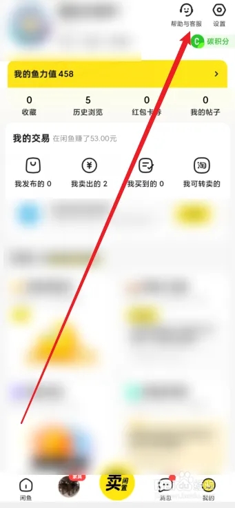 1、打开闲鱼app,点击右上角设置图标。