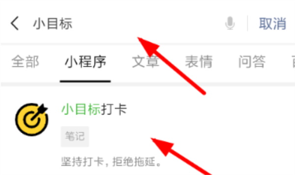 1、进入微信j9九游会主页之后,我们需要从中搜索“小目标”关键词,找到“小目标打卡”的小程序并且进入其中,从而继续下一步的设置。