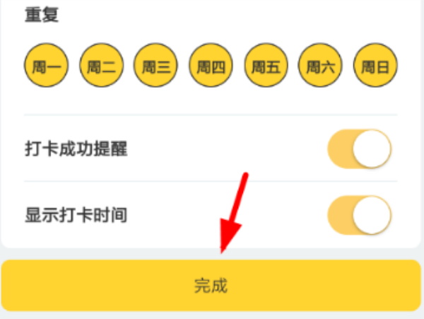 3、其中可以设置打卡小目标的持续日期,设置打卡提醒时间,重复循环周期等项目,点击底端“完成”按钮进行确认。